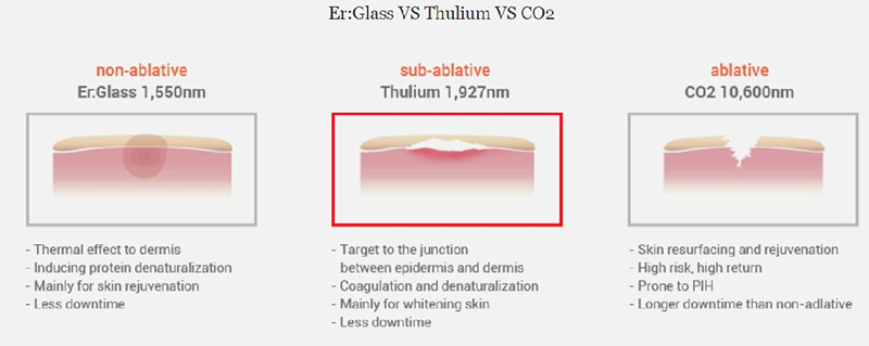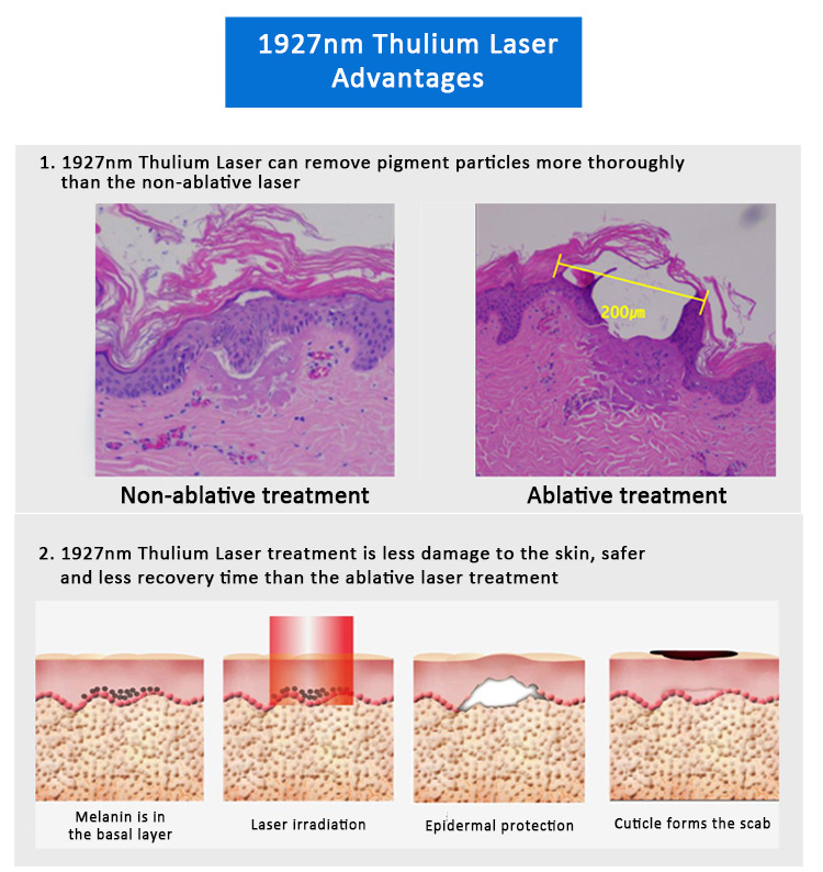 Hơn nữa, laser thulium 1927nm là cách tuyệt vời để điều trị giai điệu, tổn thương sắc tố, nếp nhăn, lỗ chân lông lớn và nhiều hơn nữa bằng cường độ năng lượng có thể điều chỉnh và thời gian xung đồng thời trong quá trình làm thủ thuật. Để điều trị sắc tố trên lớp cơ bản biểu bì, điều này từ hệ thống laser thulium này sẽ là dấu hiệu tốt nhất vì có rất nhiều melanocyte & melanin trên lớp cơ bản biểu bì.