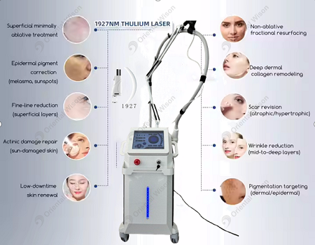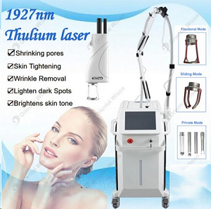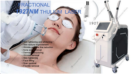 Chế độ phân số laser 1927nm Thulium là sử dụng một tay cầm phân đoạn để tập trung laser vào một điểm nhỏ (khoảng 0,1-0,15 mm) để chiếu xạ da và đạt được hiệu ứng không vi khuẩn. Laser được hấp thụ cao bởi nước. Khi laser chiếu xạ da, năng lượng laser được nước hấp thụ trong da, tạo ra hiệu ứng nhiệt. Nó có thể điều trị hiệu quả các hố và dấu hiệu mụn trứng cá, lỗ chân lông mở rộng, vết sẹo bị tổn thương mặt trời hoặc sẹo mụn, và sẹo phẫu thuật. Một cách nhất định đến lớp hạ bì của hiệu ứng quang nhiệt có thể thúc đẩy tái tạo collagen, điều trị hiệu quả các đường khô, nếp nhăn, làm trắng và trẻ hóa da.